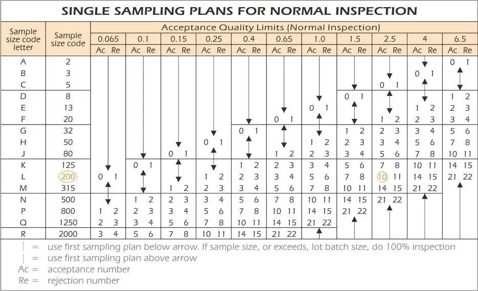 As an example, in an inspection of a 3,500-unit lot, with an Acceptable Quality Level of II, Table A indicates that sample size code letter should be “L”. Table B indicates that the sampling size of “L” should be 200 units. For an AQL of 2.5, the corresponding acceptance number is 10.